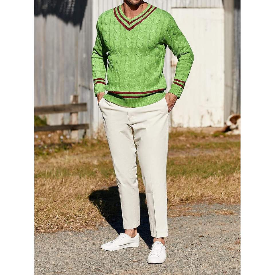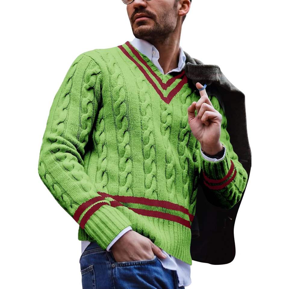2025 suéter de punto con cuello en V para hombre, Jersey térmico de ajuste relajado grueso, diseño de giro a la moda para tenis para deportes al aire libre
