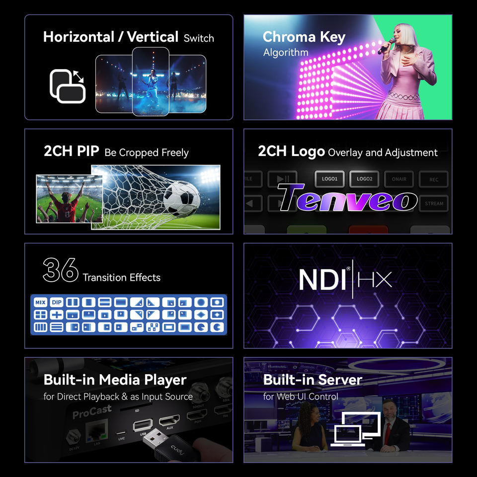 PC500 conmutador de vídeo de 5,5 pulgadas - mezclador con 5 fuentes de entrada, PST/PGM, doble salida HDMI, NDI/UVC, mezclador de webcam y audio, control PTZ y croma key