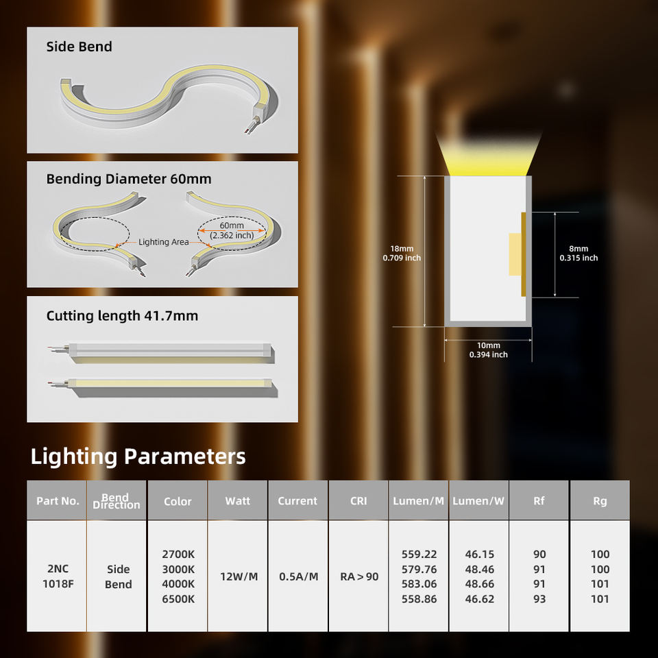 Luz de Neón Flexible de 10*18mm, Curvada Lateralmente, Solo un Solo Color, Alta Eficiencia Luminosa de 85lm/w, IP67 Impermeable, DC24V