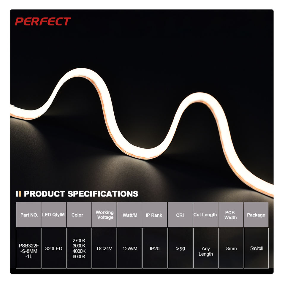 Tira de Luz LED Flexible SOB de Cobre PERFECT, IP20 No Impermeable, Integrada, Extruida, Duradera, 1 LED por Segmento, 320 LED/m, 8mm, Sin Puntos, DC24V