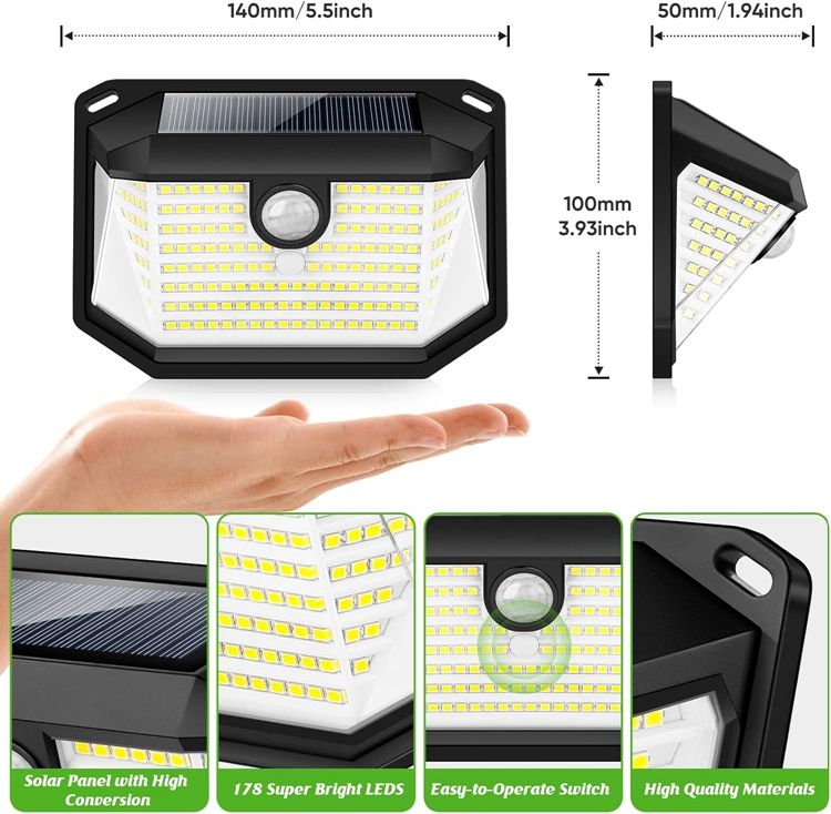 Lámpara Solar de Pared Súper Brillante IP65 Impermeable con 3 Modos, 178 LED, Sensor de Movimiento PIR, Lámpara de Seguridad Exterior para Jardín, Camino, Patio