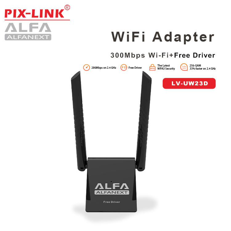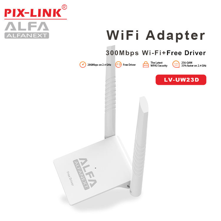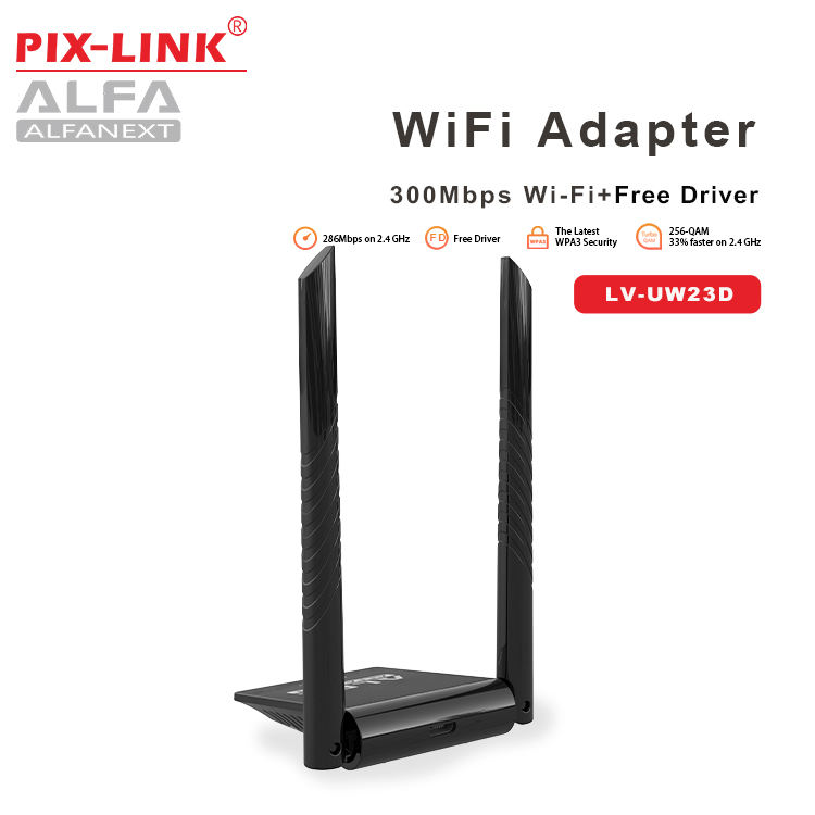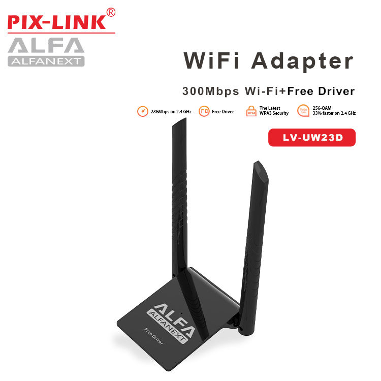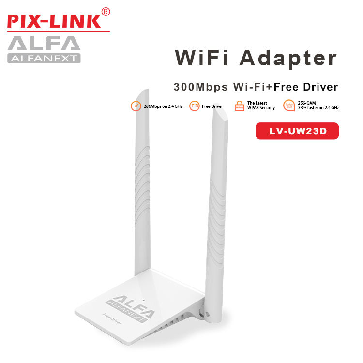 PIX-LINK ALFA NEXT Tarjeta de Red Inalámbrica de Alta Potencia de 300 Mbps con Controlador Gratuito, Adaptador Wifi USB con 2 Antenas Externas para PC