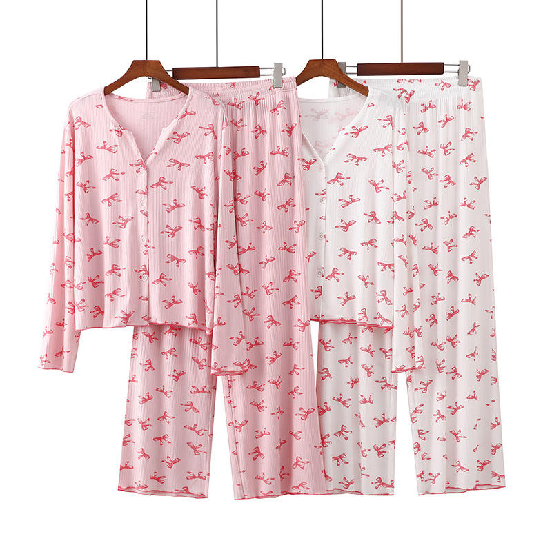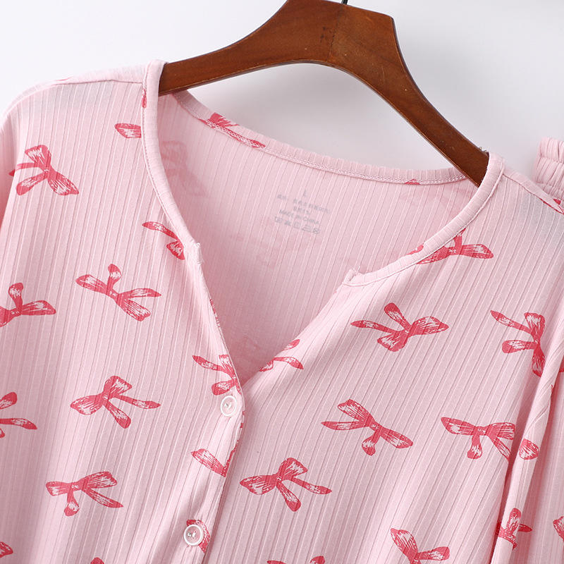 PJ-055 Conjunto de pantalones de manga larga de modal acanalado para mujer, cárdigan con cuello en V, ropa para el hogar, rosa, blanco