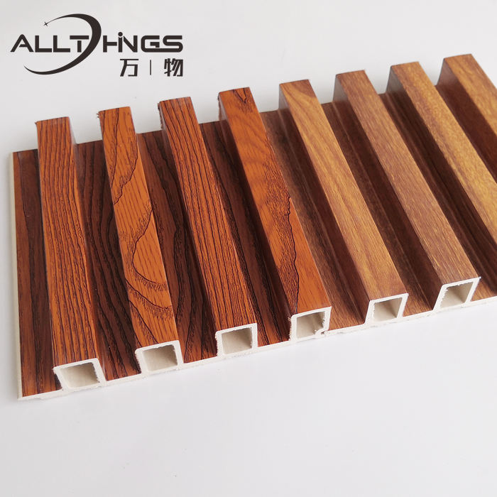 Panel de Pared Ranurado de PVC con Fondo de Rejilla y Tres Rejillas con Aspecto de Madera WPC