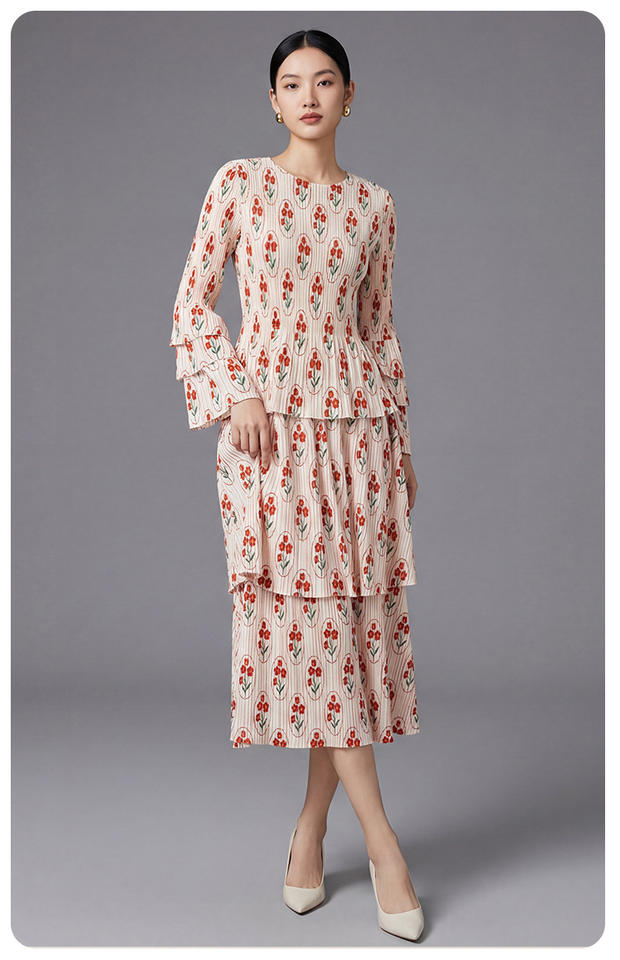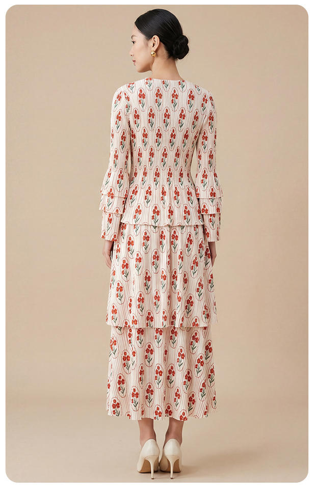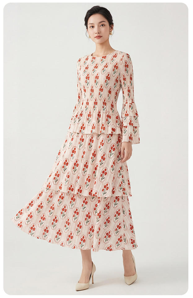 Vestido Maxi Floral con Volantes de Diseño PY Fashion, Elegante y Casual para Mujer, Doble Capa, Estilo Coreano, Poliéster, Venta al Por Mayor