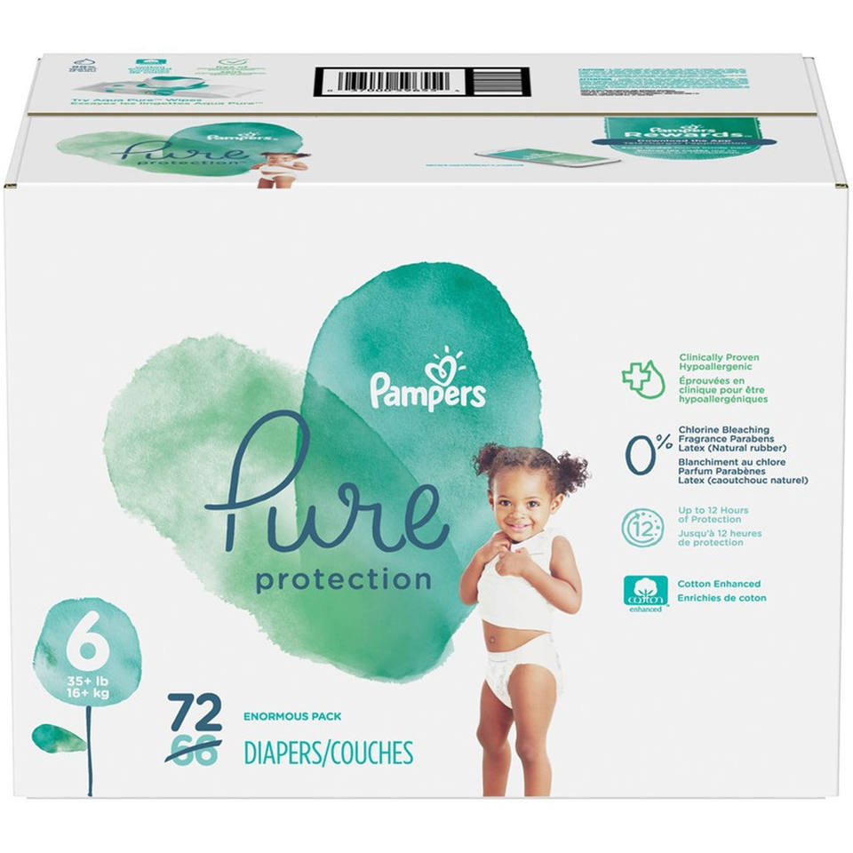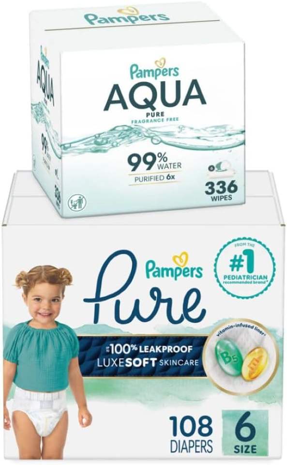 Pañales desechables Pampers Pure Protection talla 6, suministro para 2 meses (2 x 108 unidades) con toallitas húmedas Aqua Pure Sensitive para bebés