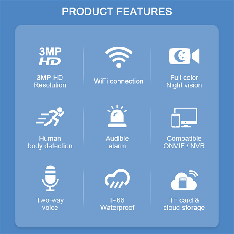 Monitoreo de inclinación de pan, Audio bidireccional, chat en tiempo real, alarma de detección de movimiento, IP66, resistente al agua, exterior, 3mp, visión nocturna, cámara wifi