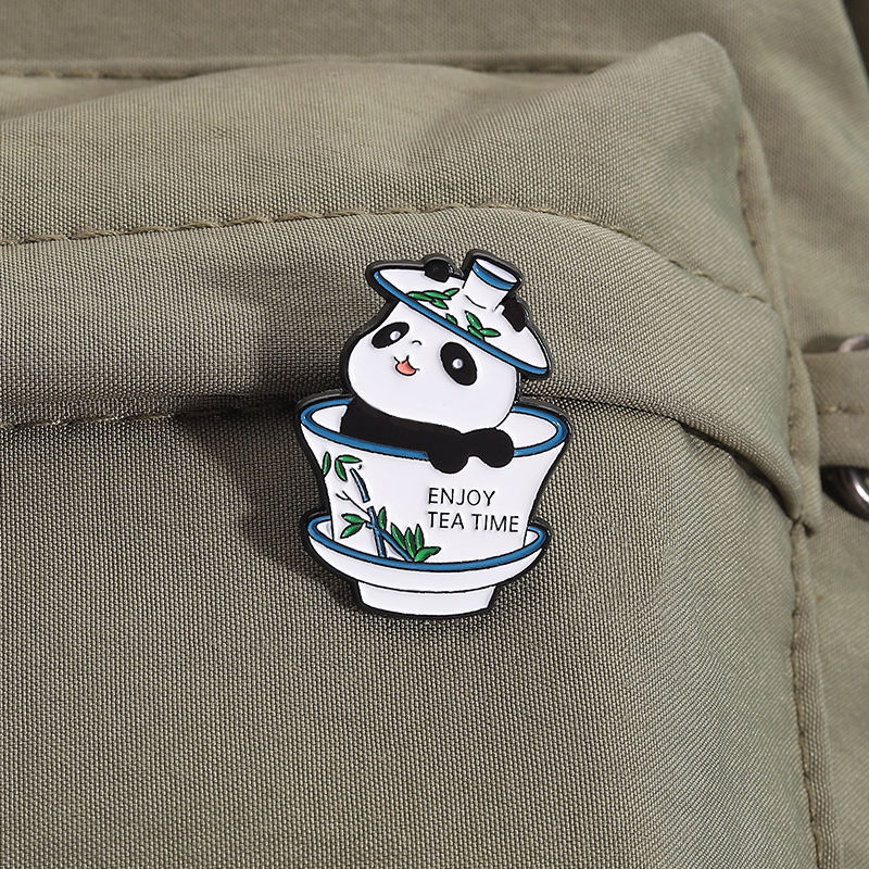 Panda bebiendo té esmalte Pin relajante oso broche solapa insignia mochila accesorios joyería regalo para amigos