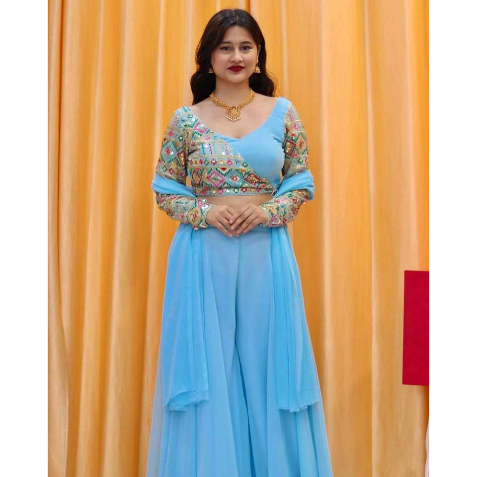Mono de Fiesta con Blusa Plazzo y Dupatta Adornado con Hilo y Trabajo de Secuencia para Ocasiones Festivas