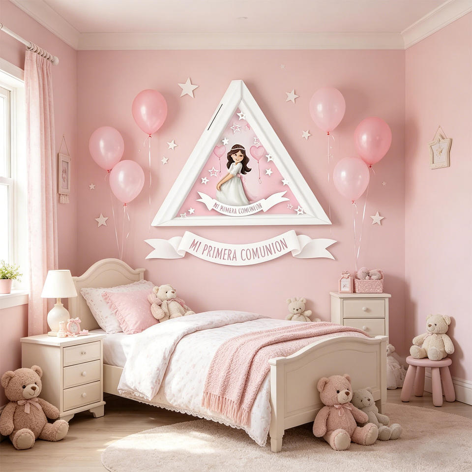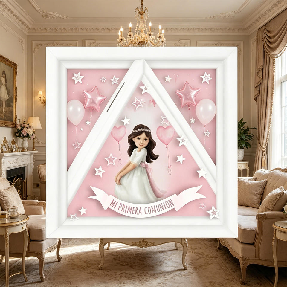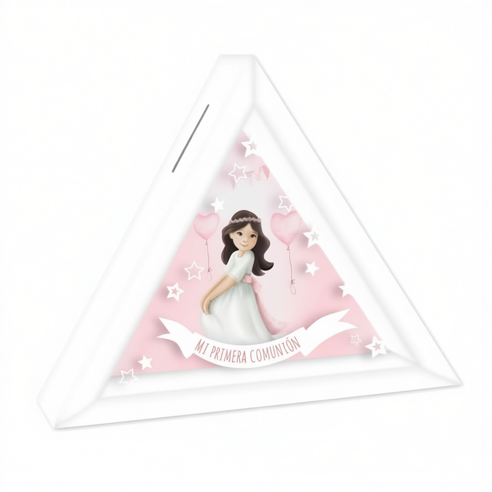 Hucha Triangular de Plástico Blanco para Niña, con Diseño de Comunión y Estampado de 4 Colores, 19.8x19.8x5cm, 2 Piezas por Bolsa, para Edades de 8 a 13 Años
