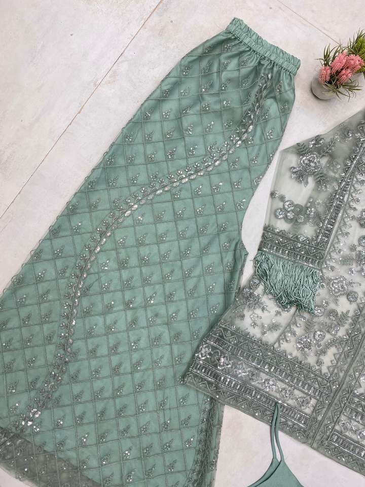 Listo para usar estilo Bollywood Micro Butterfly Net Kurta y Plazo Set Secuencia de hilo Trabajo Tallas M a XXL para fiestas