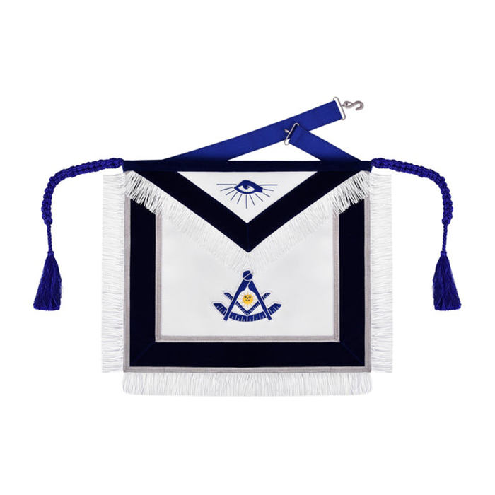 Delantal Past Master Blue Lodge bordado a mano con encaje de flecos plateados y cordón de borlas