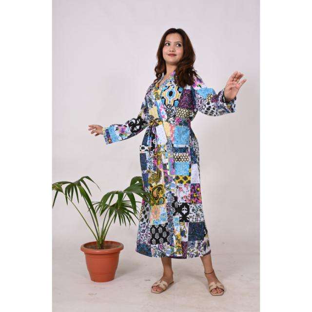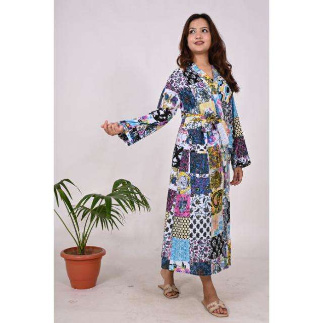 Bata de Kimono de algodón con estampado de bloques de retazos para mujer, hecha a mano en la India, ropa de dormir floral bohemio, bata de dormir suave