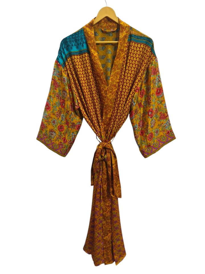 Patchwork Kimono Robe Bikini Cover Up Night Wear Long Robe, hecho a mano indio Vintage reciclado seda Sari Kimono,