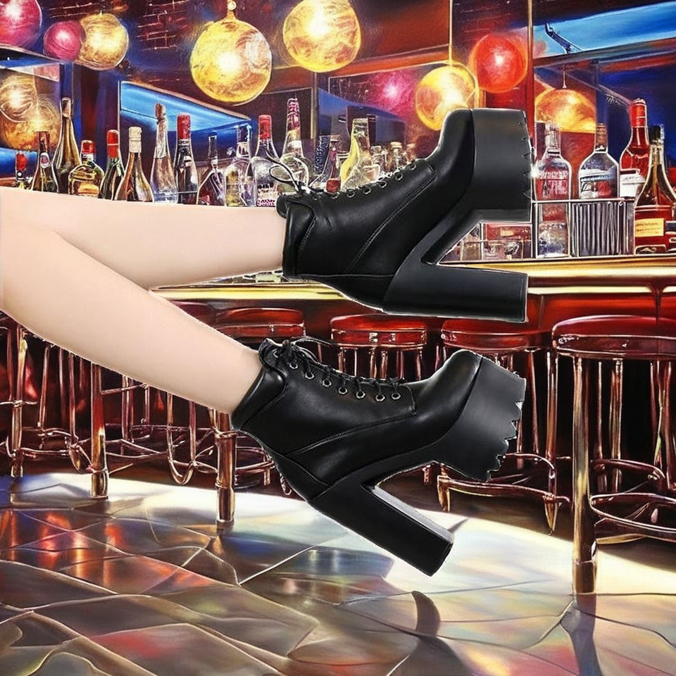 Botas de Tacón Alto con Plataforma de Doble Capa, Punta Cuadrada, Material Brillante Patentado, Cordones, Parte Superior de PU y Suela de PVC