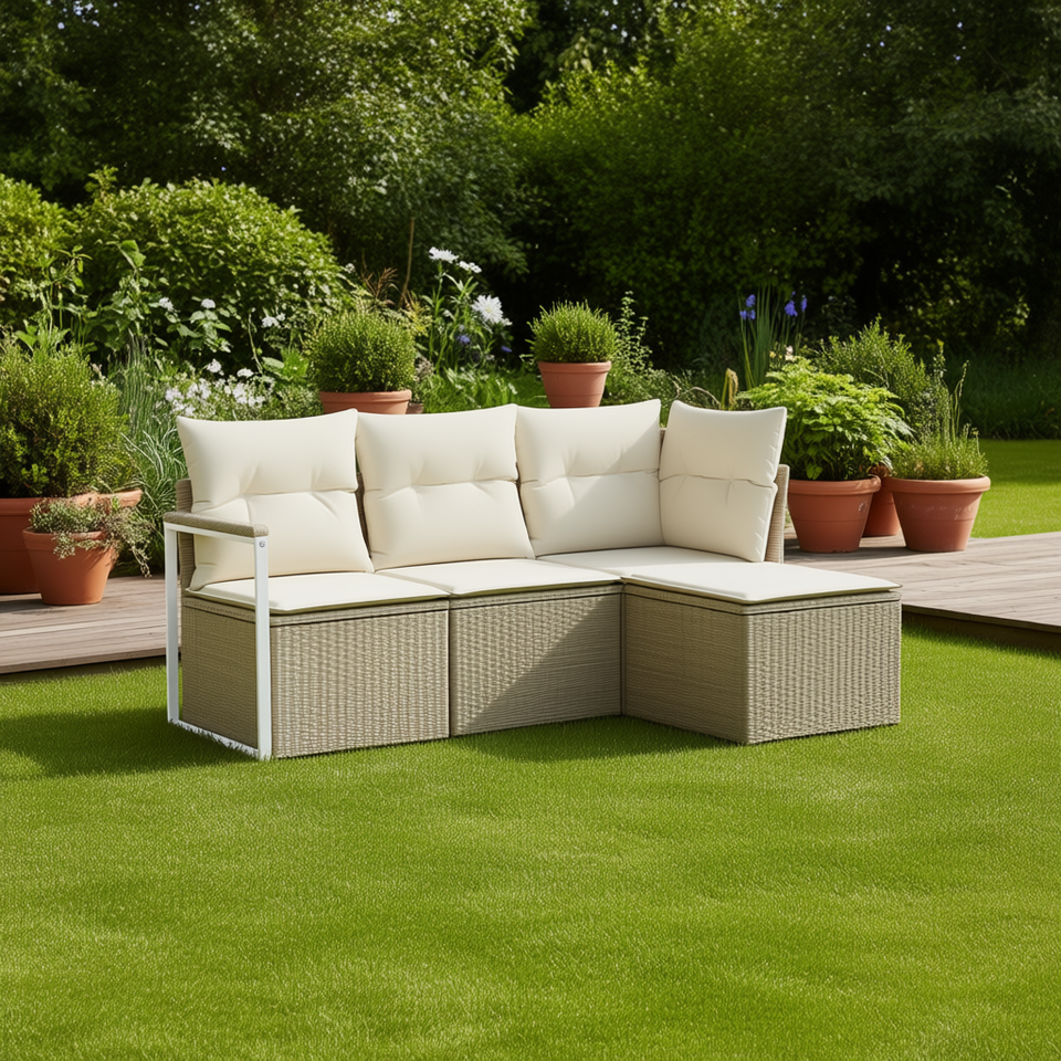 Conjunto de Sofás de Jardín de Mimbre Sintético, Color Beige, Muebles de Exterior de Diseño Contemporáneo, Cojines de Espuma de Alta Densidad
