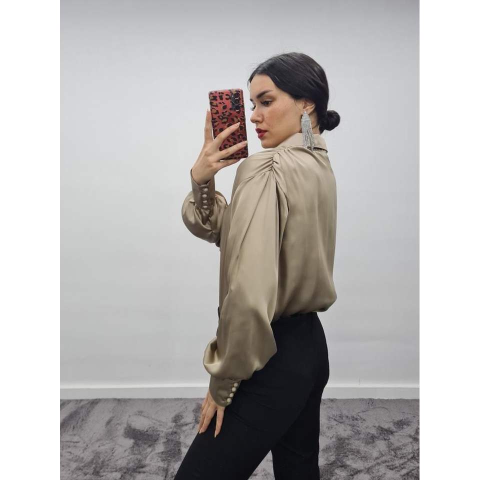 Blusa de Satén con Botones de Perla para Mujer, Talla S, Color Beige, Elegante, Manga Larga