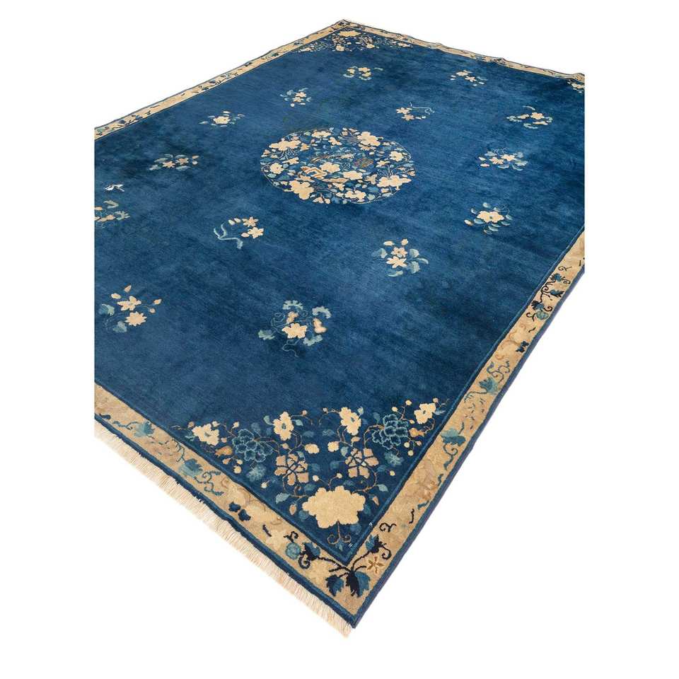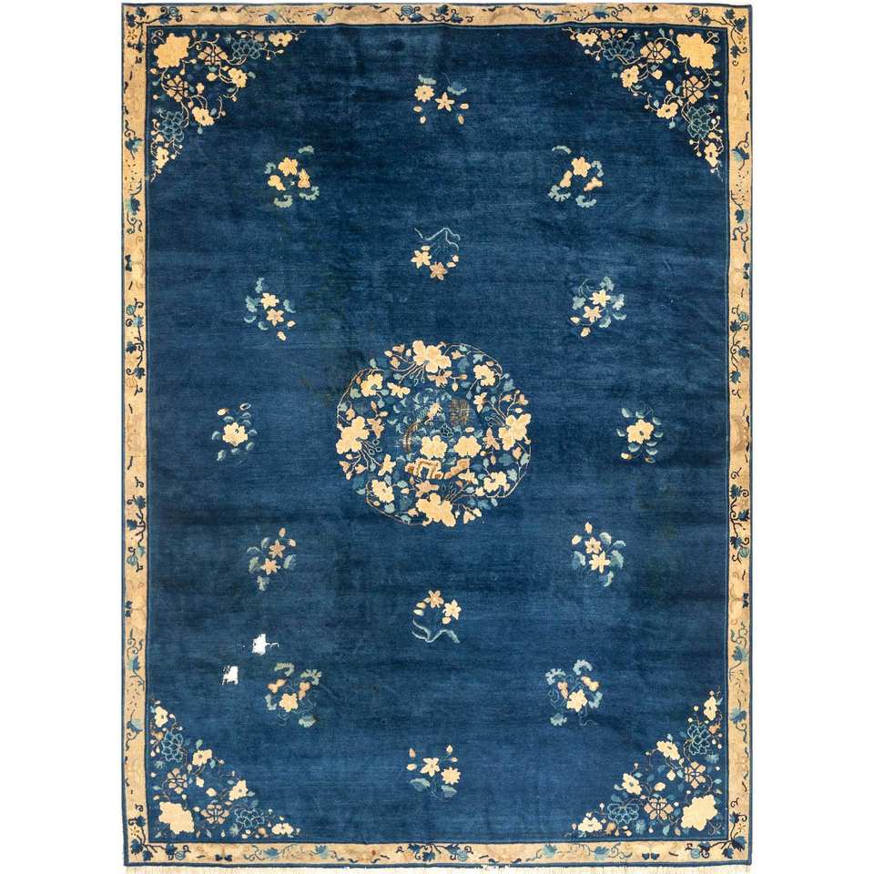 Alfombra de Lana Anudada a Mano Pechino Azul Paem-1520 con Patrón Floral Abstracto para Sala de Estar, Pasillo, Rectangular, Tipo Rompecabezas