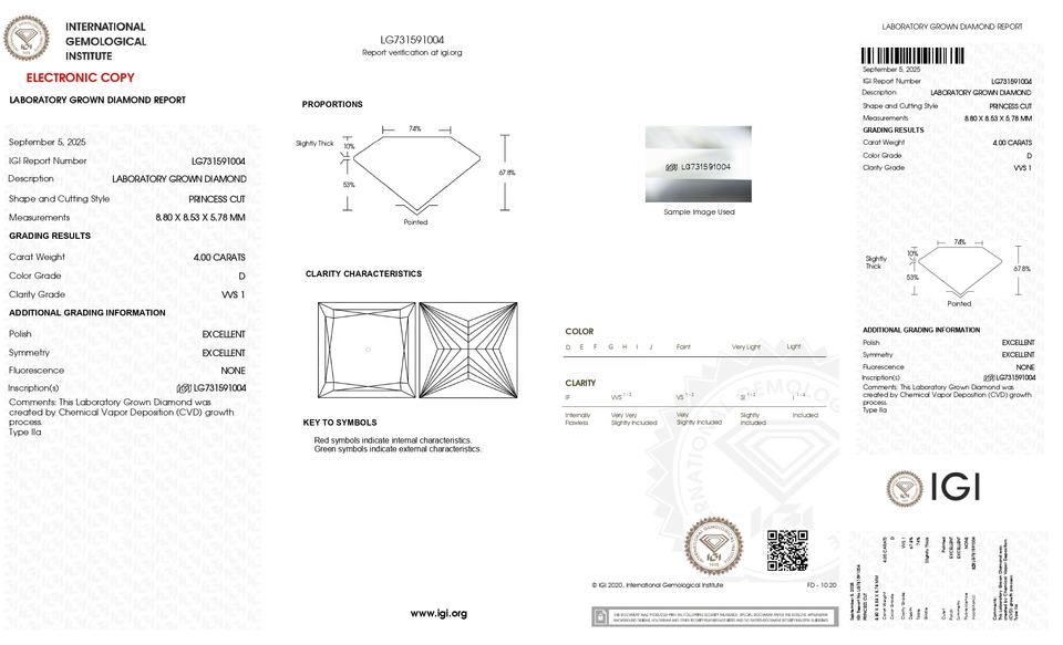 Diamante CVD Cultivado en Laboratorio de Corte Princesa de 4.00 Quilates, Claridad VVS1, Color D, con Certificado IGI, Ajuste Perfecto para Configuración Personalizada