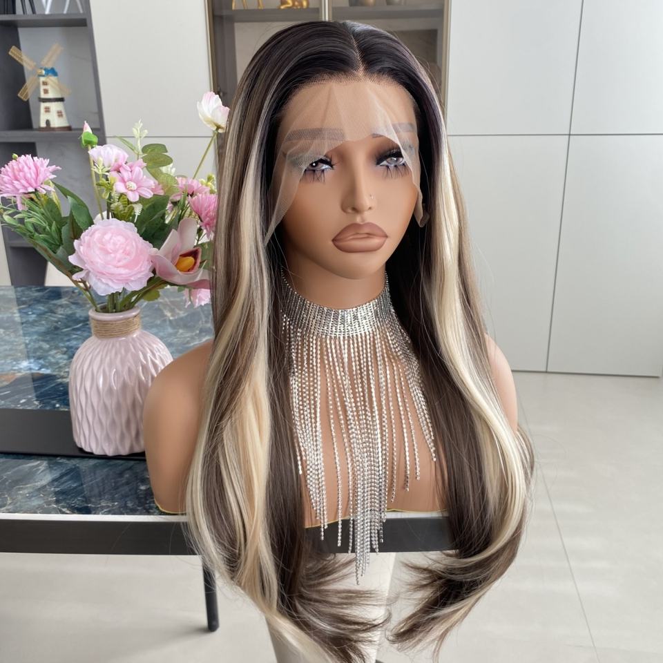 Pelucas de Fibra Sintética sin Pegamento de 22 Pulgadas de Calidad Perfecta, 13x4, con Reflejos Rubios, Frente de Encaje Transparente