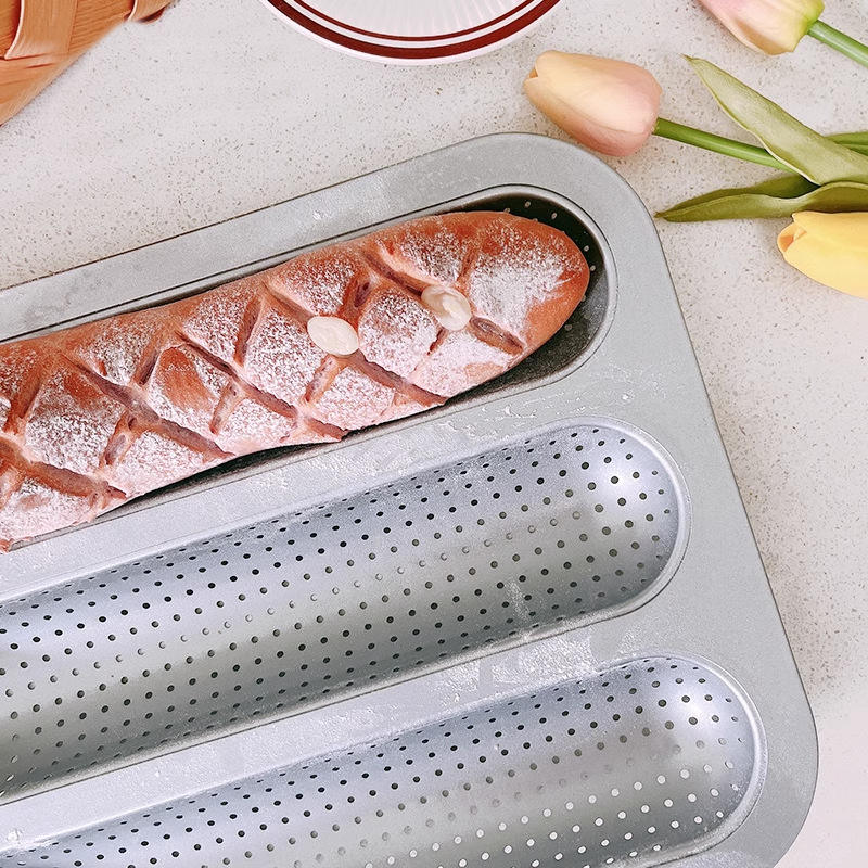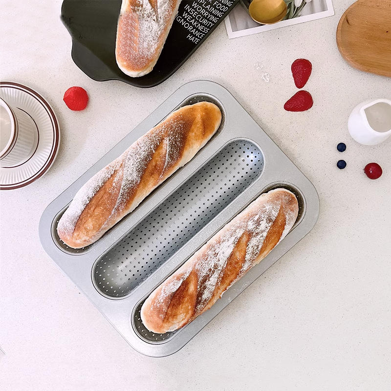 Bandeja perforada para hornear pan francés, 3 ranuras, acero al carbono, apta para horno, molde para baguette rectangular, plateado y negro