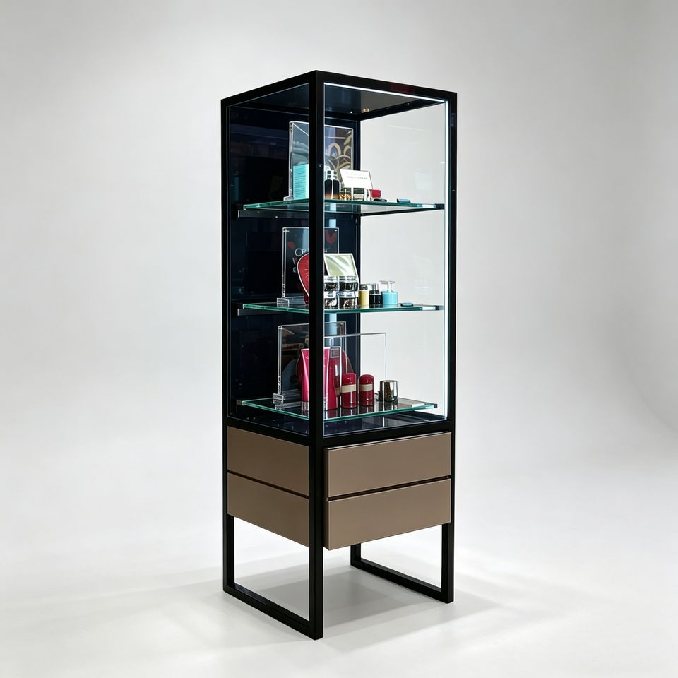 Exhibidor de Perfumes con Cajones de Almacenamiento, Vitrina de Metal y Vidrio de Pie para Productos de Cuidado de la Piel de Lujo en Tiendas Minoristas