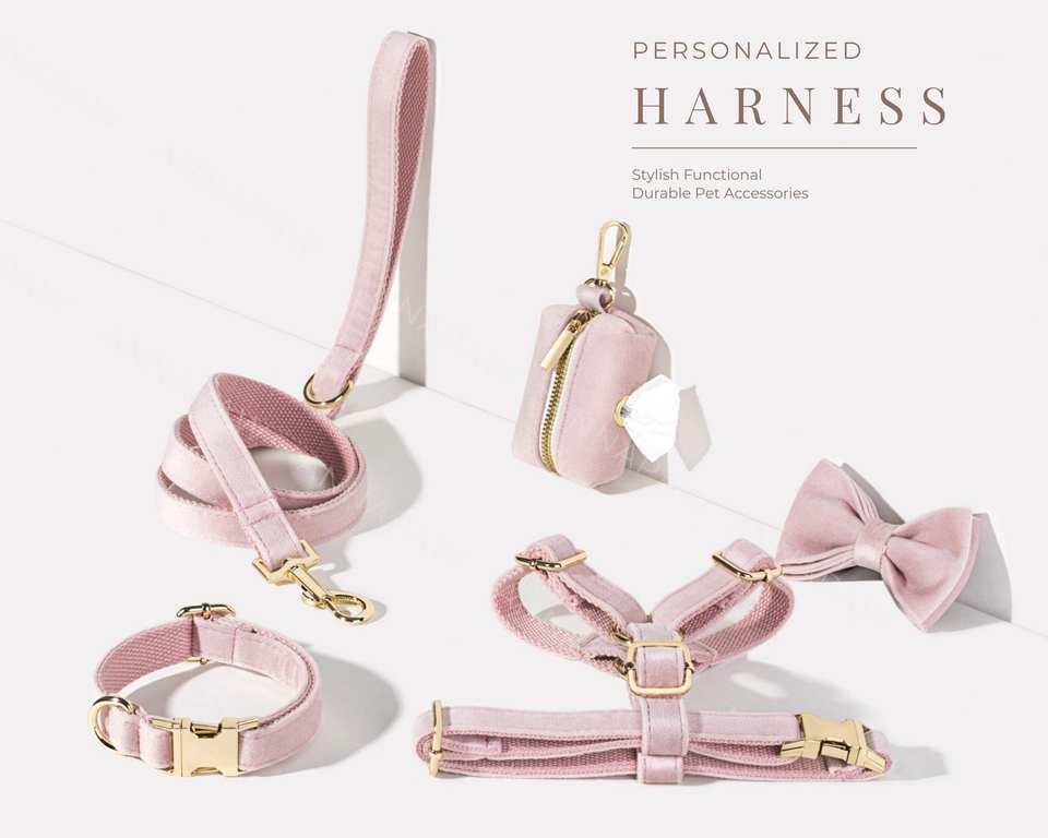 Juego de correa de arnés Rosa personalizado para perro con placa de identificación grabada, arnés Veet suave, correa para cachorro, dispensador de bolsas para caca de cachorro