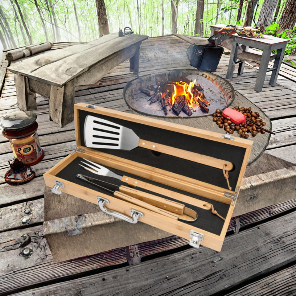 Juego de 3 Utensilios para Barbacoa Personalizados, de Bambú Natural y Metal, Accesorios para Barbacoa para Exteriores, Caja de Regalo Incluida