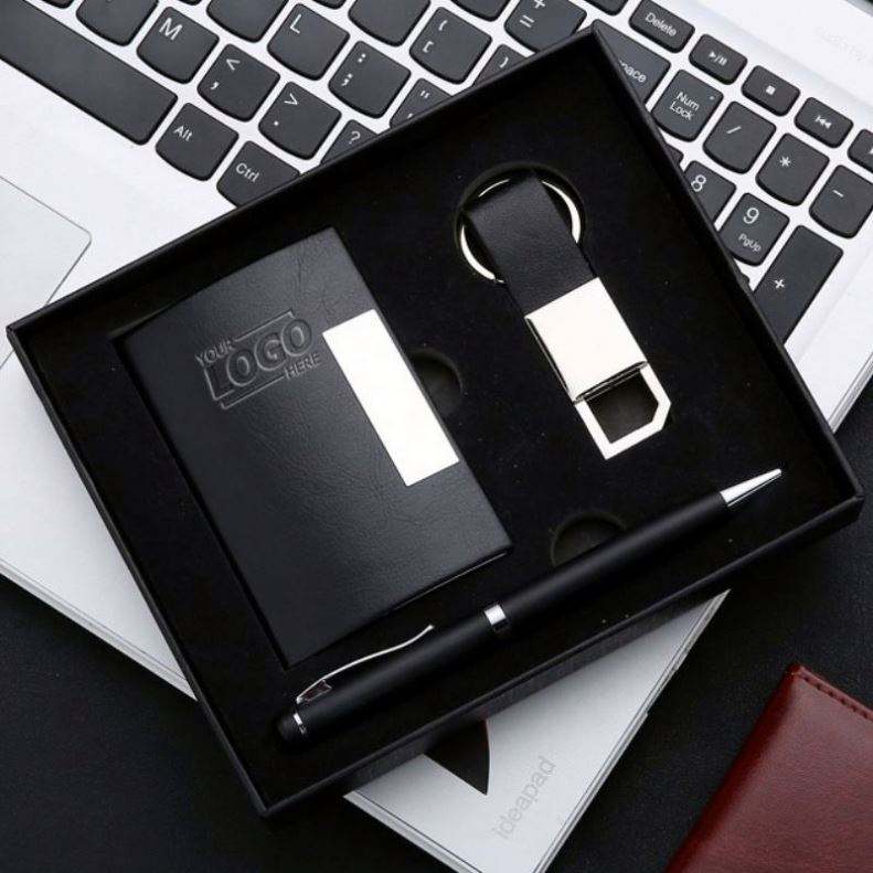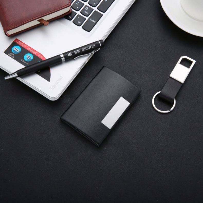 Set de Regalo Empresarial Personalizado con Logotipo, Llaveros de Cuero PU, Tarjeteros y Bolígrafos con Impresión Digital para Marca Corporativa
