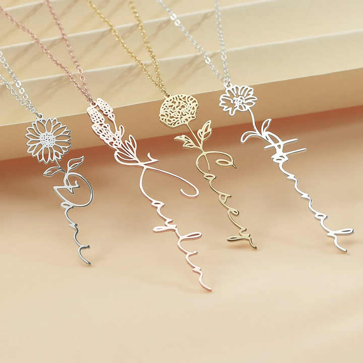 Collar con Nombre Personalizado, Acero Inoxidable Dorado S925, Flor de Nacimiento, Collar con Colgante Minimalista para Parejas, para Mujer