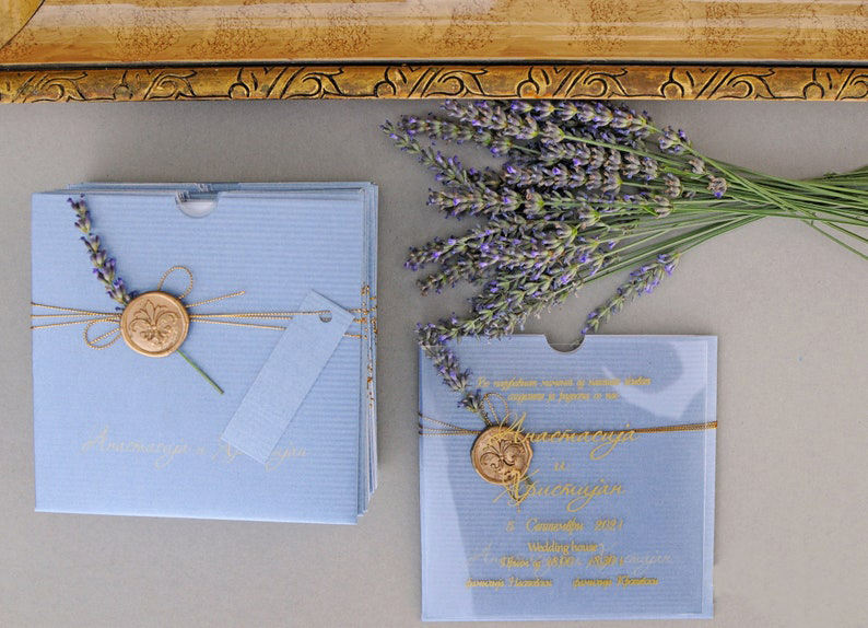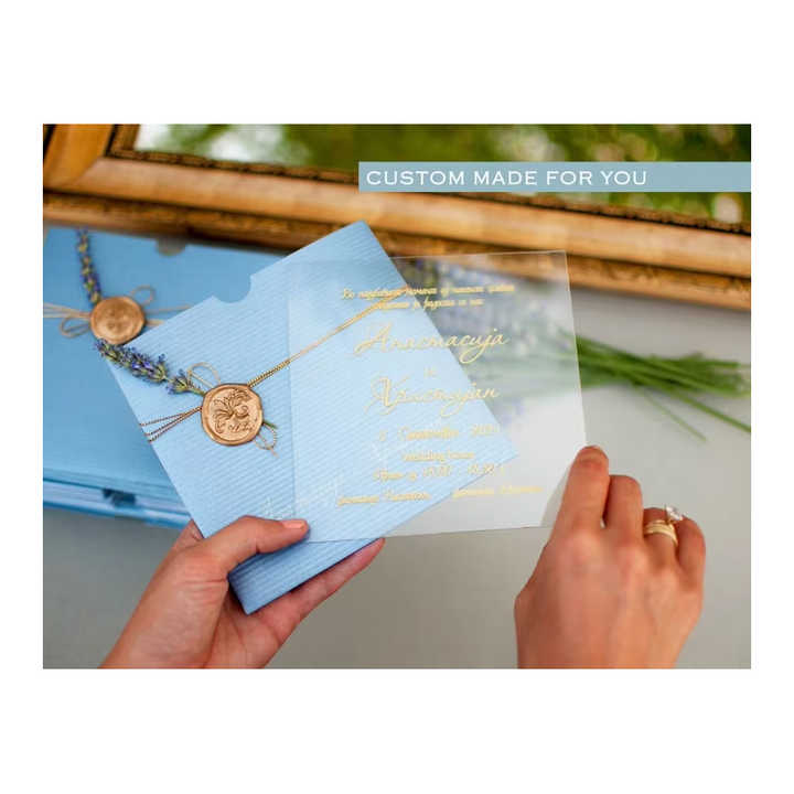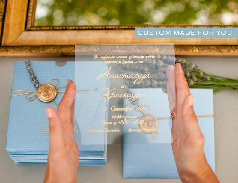 Tarjeta de invitación acrílica transparente de plexiglás con sobre azul cielo personalizado para boda, fiesta, cumpleaños, dulce 15 invitaciones