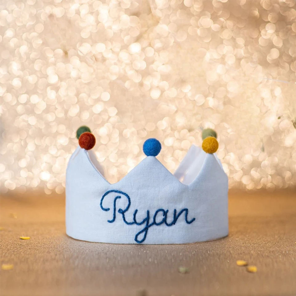 Personalizado bordado nombre Lino corona decoración Primer cumpleaños fiesta sombrero para bebé con fieltro Pom