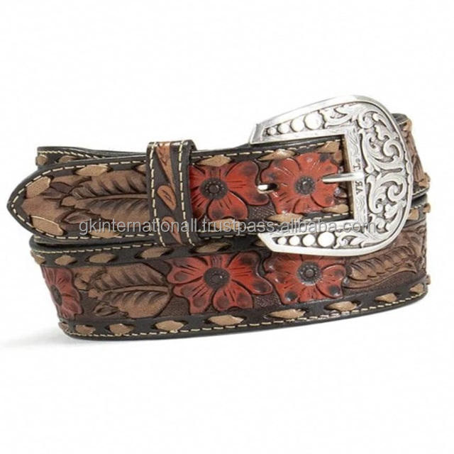 Cinturón de herramientas de cuero occidental de moda para hombre tallado a mano en relieve con diseño floral personalizado con hebilla de latón de diseñador