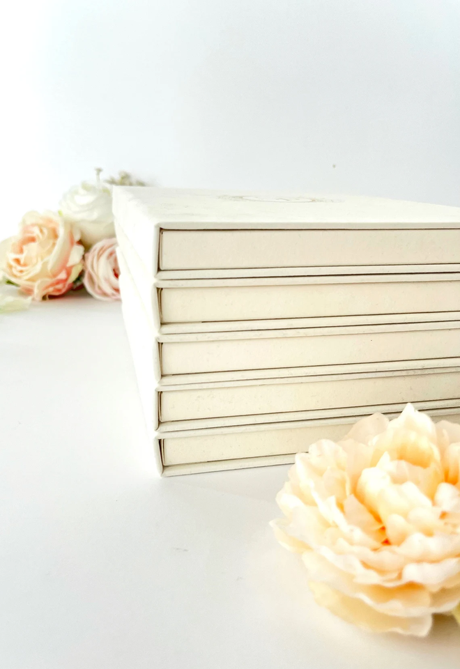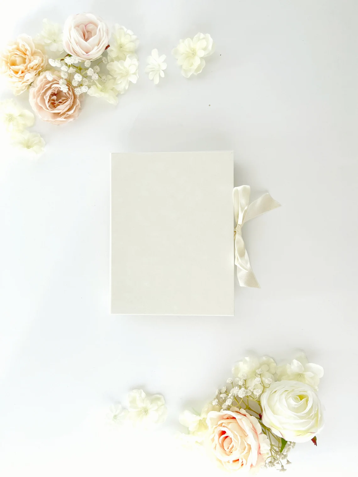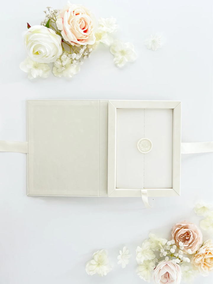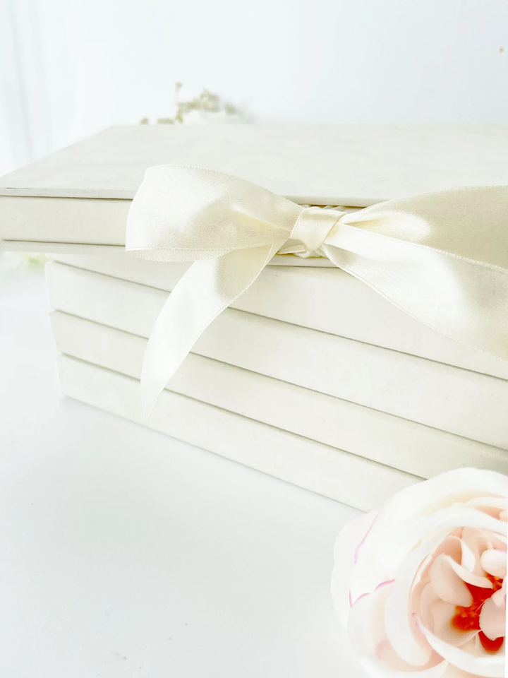 Caja personalizada de terciopelo crema de recuerdo con lazo de cinta para invitación de boda lujosa de 5x7, cajas de monograma con láminas doradas