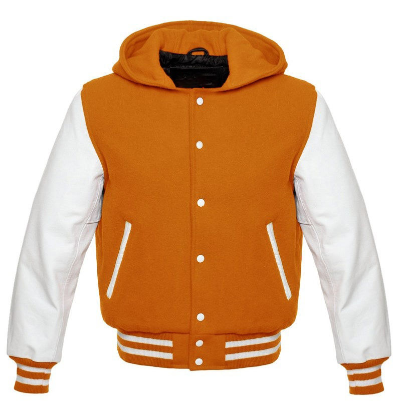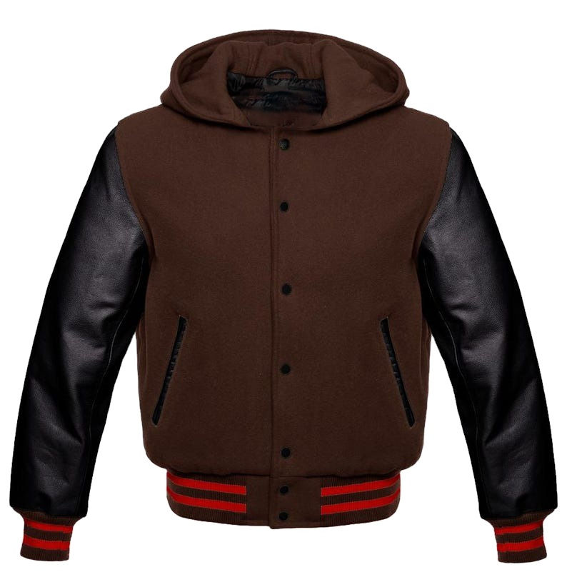 Chaqueta personalizada para hombre, cuerpo de lana y brazos de cuero, chaqueta universitaria con capucha roja personalizada, chaqueta con letras universitarias de primera fila
