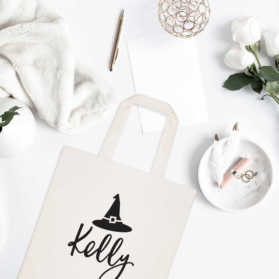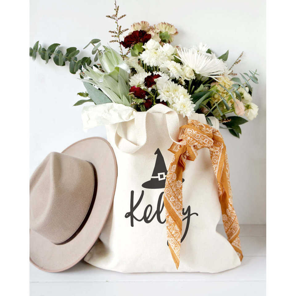 Personalized Name Open Closure Solid Color Witch Cotton Canvas Tote Bag