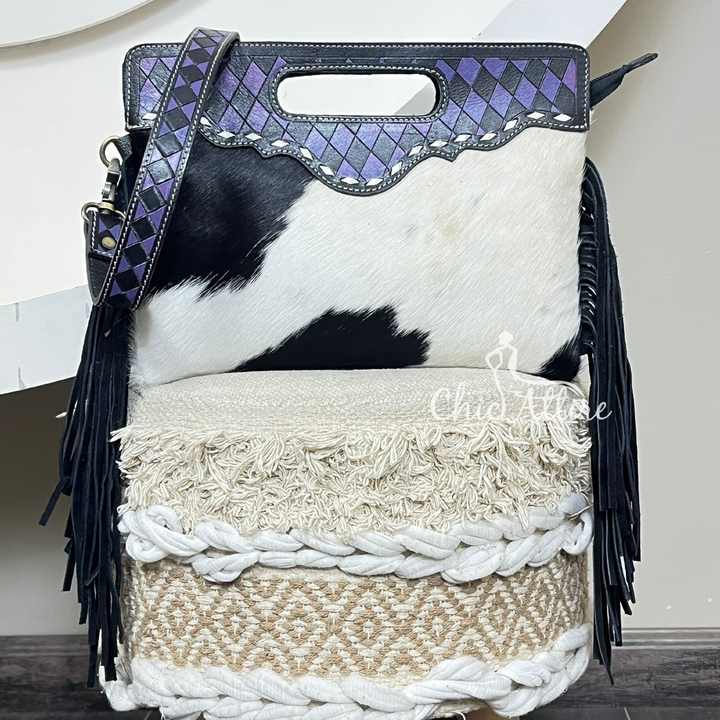 Nombre del producto:Bolso bandolera de piel de vacuno repujada a cuadros con flecos y asa