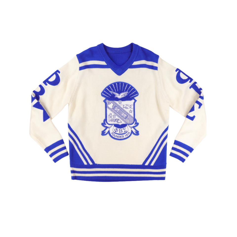 Phi Beta Sigma Suéter con cuello en V Azul marfil HBCU Ropa de fraternidad griega 30 Lana 70 Acrílico Chenille Bordado Punto Ropa griega