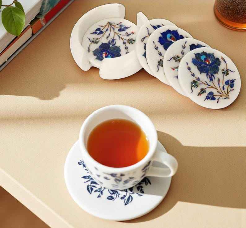 Juego de Posavasos de Mármol con Incrustaciones de Piedra Dura, Posavasos Hechos a Mano con Piedras Semipreciosas
