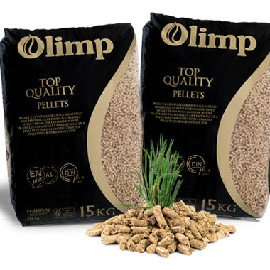 Pellets de Madera de Pino Olimp 6mm Certificación ENplus A1 y DINplus Bolsas de 15kg Sistema de Calefacción 600-800kg/m Densidad Hecho en Europa