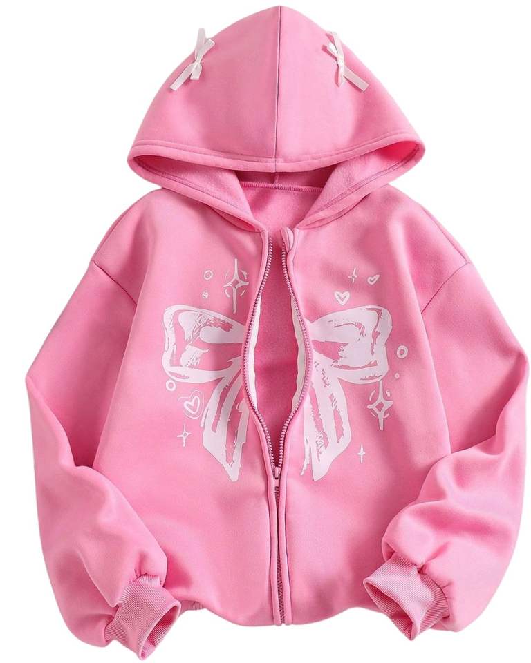 Sudadera con Capucha y Cremallera con Estampado de Mariposa y Lazo Rosa para Mujer, Sudadera con Capucha de Forro Polar, Chaqueta de Estilo Urbano