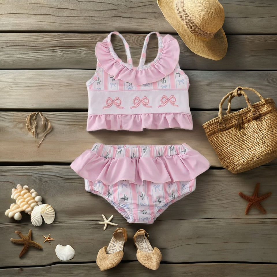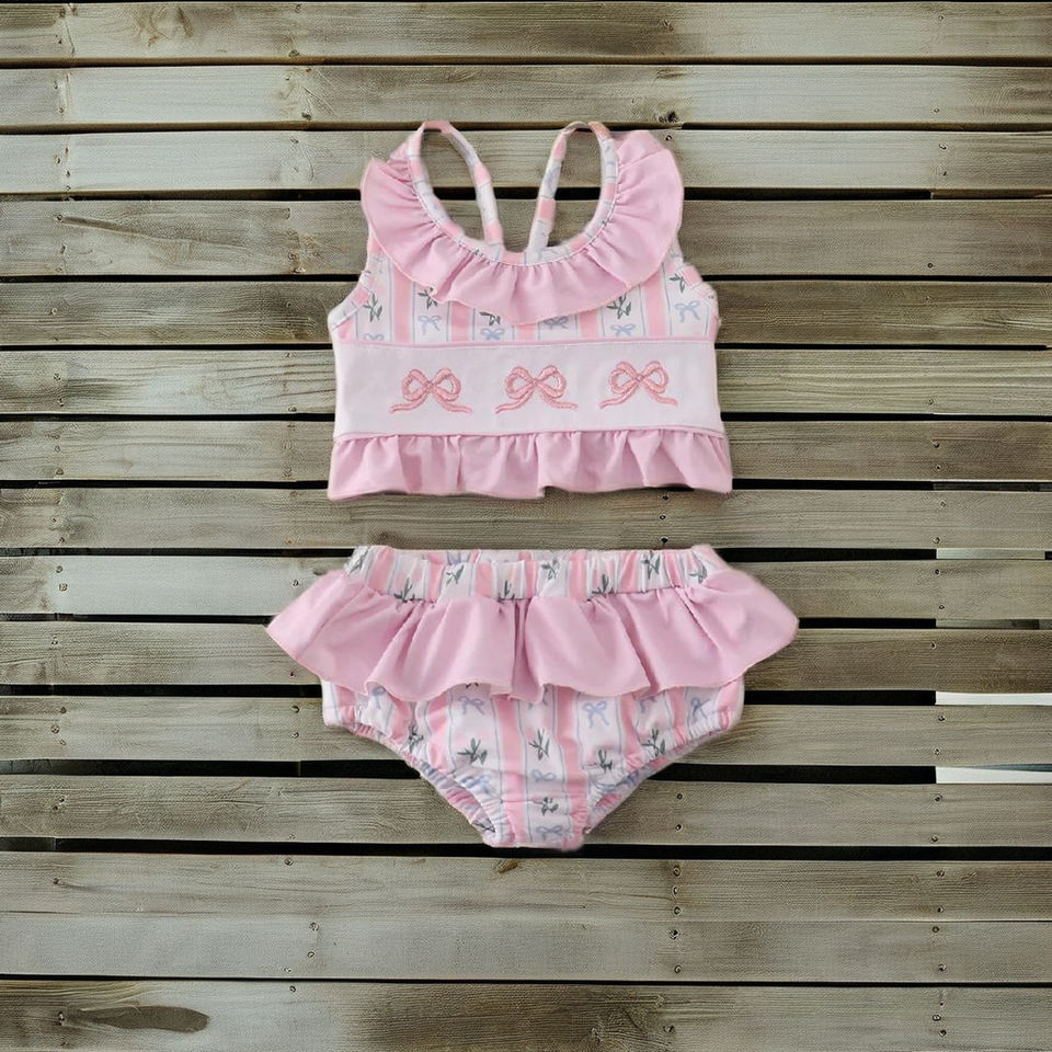 Conjunto de traje de baño con bordado de lazo rosa de dos piezas bonito y cómodo para niñas vestido elegante de día de playa o piscina para niñas