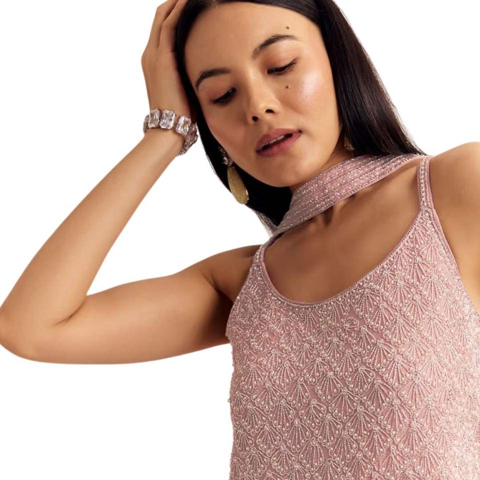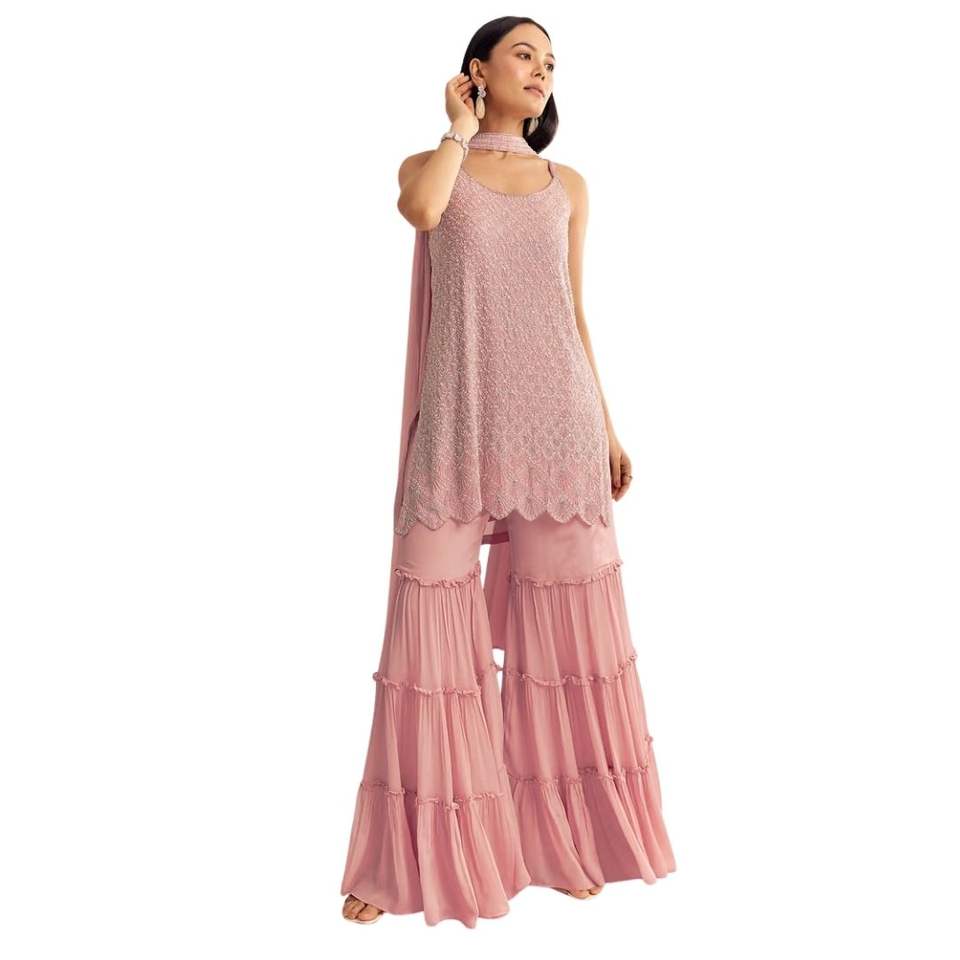Pink Chinon Kurta Set con Cutdana Moti y Gargantilla Dupatta Designer Wedding Sharara Suit para mujer elegante Traje festivo