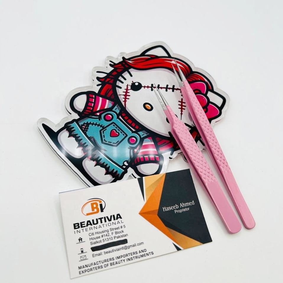 Pinzas de belleza rectas recubiertas de Color Rosa Pinzas de extensión de pestañas con logotipo grabado personalizado de acero sostenible con azulejo de pestañas