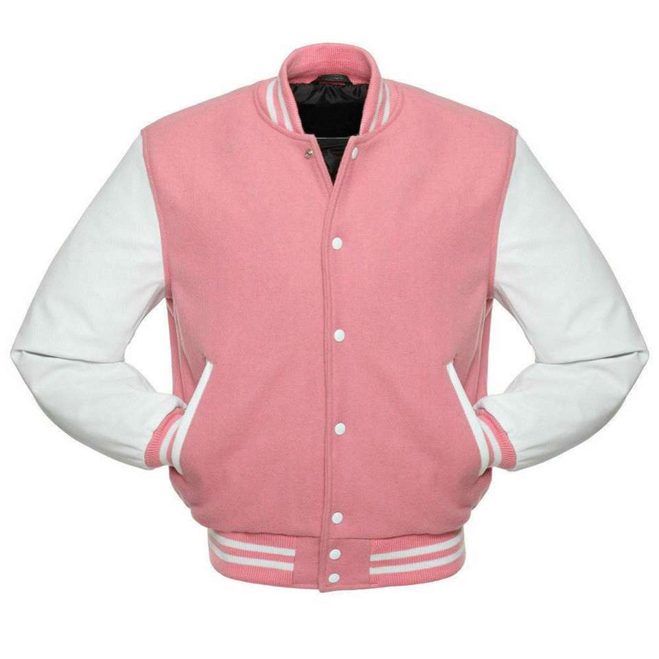 Chaqueta universitaria de lana color rosa con mangas de cuero genuino blanco, estilo Letterman, para hombre.