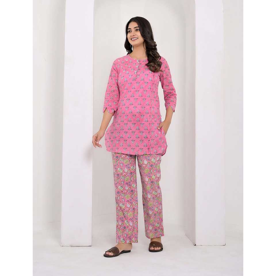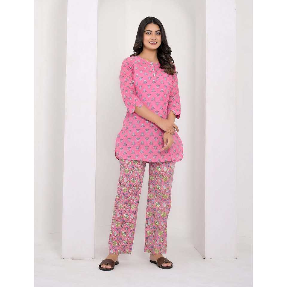 Conjunto de Dos Piezas de Algodón Rosa con Decoración de Botones XS/XS, Top de Manga Tres Cuartos y Atuendo de 2 Piezas para Mujer para Uso Diario