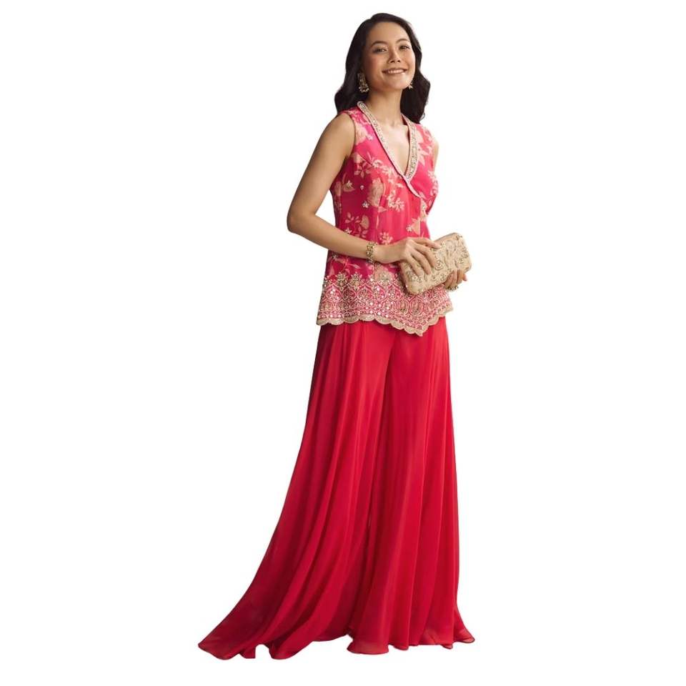 Traje Palazzo con estampado floral de crepé rosa con trabajo de espejo, venta al por mayor, Ropa Étnica para mujer, fábrica de ropa OEM, proveedor a granel personalizado