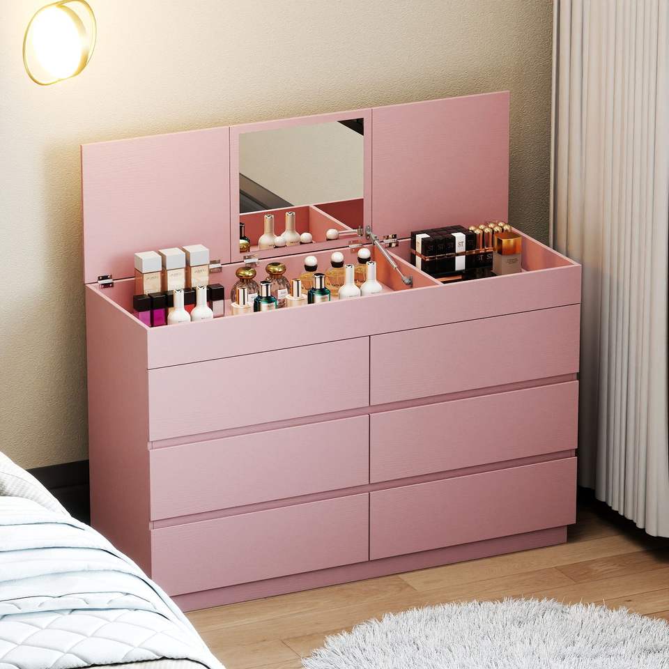 Cómoda de Aglomerado Rosa con Relieve ZSH012 P2 de 12 mm con Seis Cajones y Espejo 120*40*85.5cm con Chapa de Melamina
