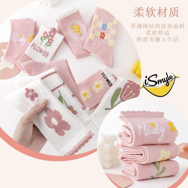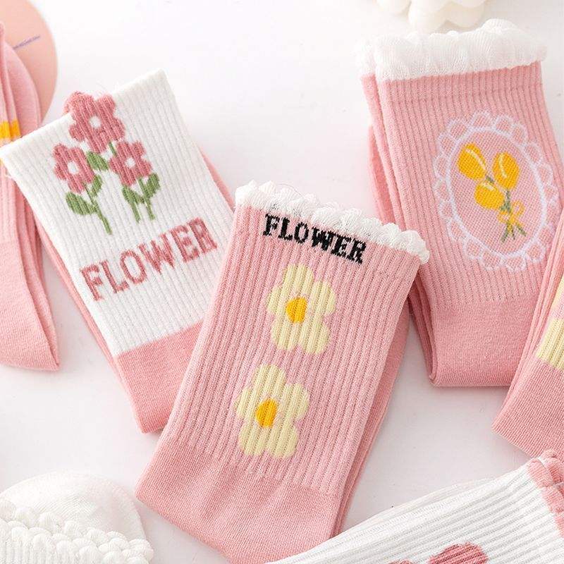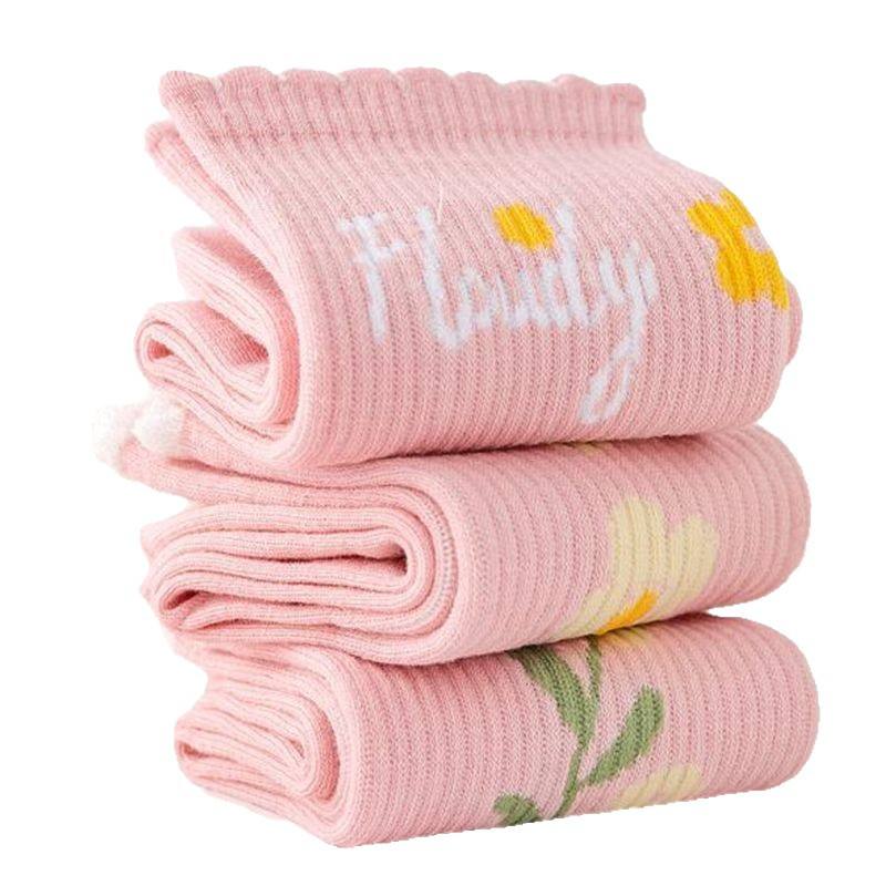 Pink Floral Mid Calf Socks For Women Breathable Jacquard Knee High Casual Sport Style