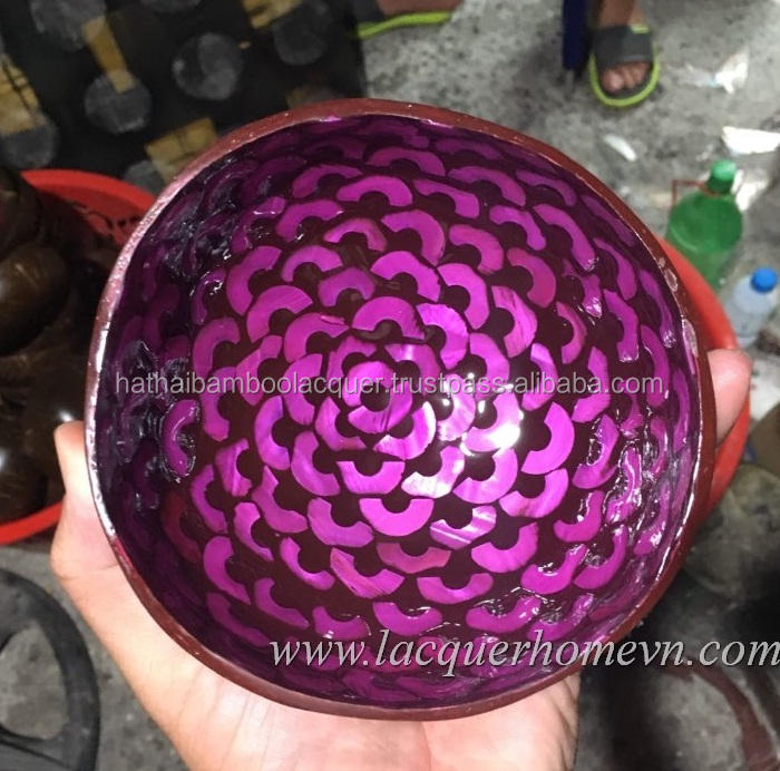 Pink Flowers Design Inlay Inside Coconut Shell Bowls, Bamboo Bowls from Vietnam